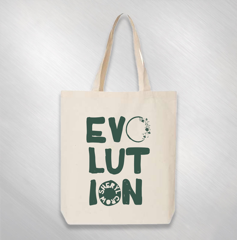 Natural cotton tote bag with green screen-printed Evolution graphic.